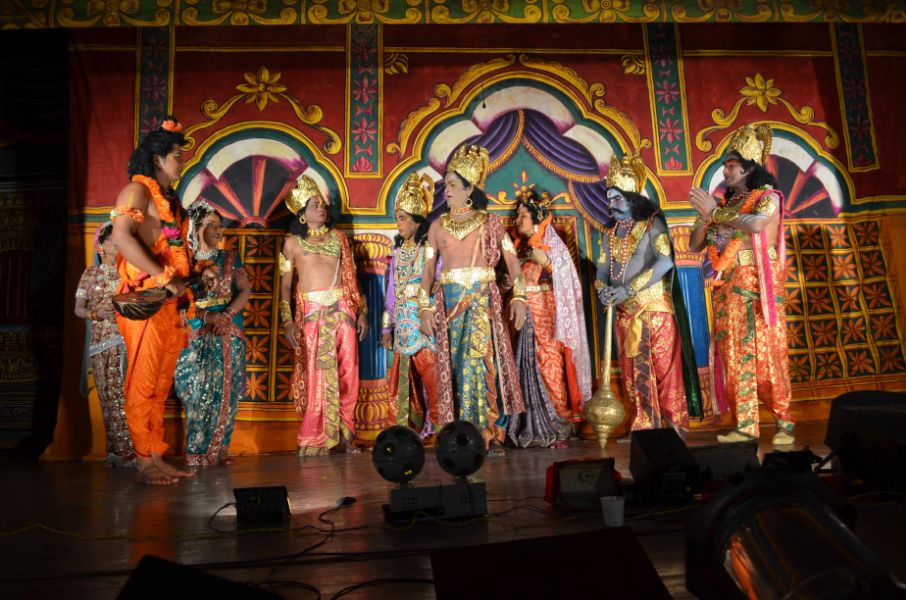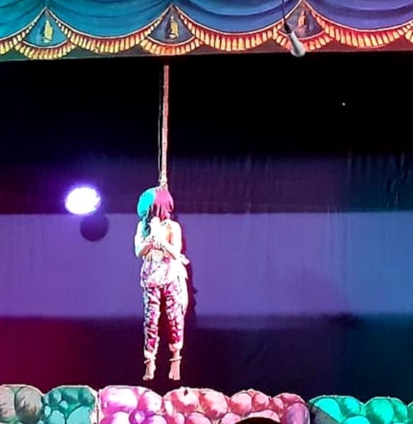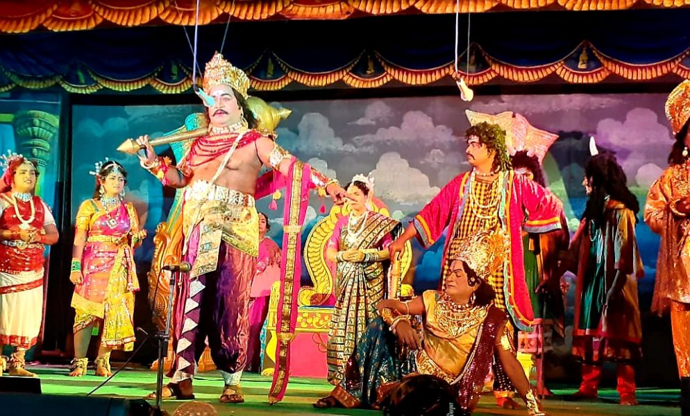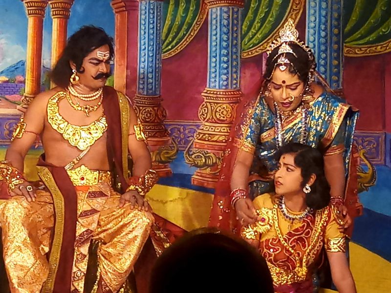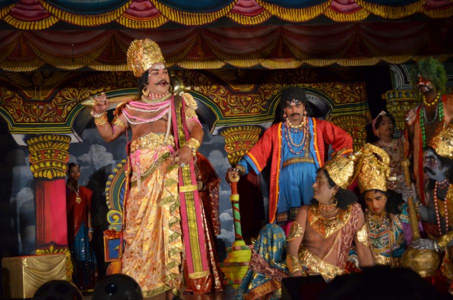 One day, got sick with the arguments with his son, Hiranyakashyapa asks his son Prahlada to show Lord Vishnu if the Lord has courage enough to face him. Prahlada relies in a different manner that one can find Lord Vishnu anywhere and everywhere since he is omnipresent. The enraged Hiranyakashyapa compels Prahlada to show his Lord in a pillar and breaks it with his mace. From the broken Pillar, miraculously, Narasimhavathara, the incarnation Human Lion comes out. Narasimha lifts Hiranyakashyapa, places the king him on his lap on the threshold, at sunset and kills Hiranyakashyapa with his nails pierching into stomach.