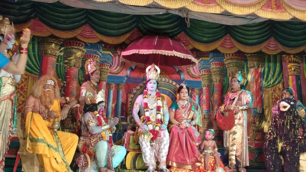 Story: Sri Rama along with Sita, returned to Ayodya, after killing Ravana and his followers. The drama starts with Sri Rama Pattabhisekam. He ruled the kingdom with peace and joy. He used to get the daily information about his people by “Bhadra”. In the meanwhile, Bhadra, one day he was shy and unhappy to say a unfortunate information to Rama i.e., a washerman was quarrelling with her wife, he quarreled said that was not like “Rama”, who brought his wife, after spending one year with Ravana.